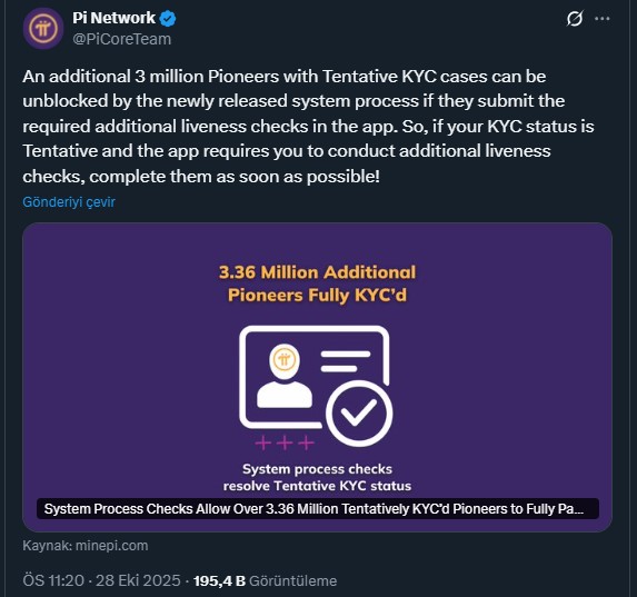 Sosyal medya gönderisinde kullanıcılara kontrol durumunda nasıl ilerleyeceğini de açıkladı. Ayrıca bu gelişme kullanıcıların token erişimini sağlıyor. Pi Network’un sorun yaşadığı alanlardan biri olan KYC ve token kullanımını sorununu ortadan kaldırmayı hedefleyen güncelleştirmeler sonrasında ağa daha fazla katılım sağlanması bekleniyor.
