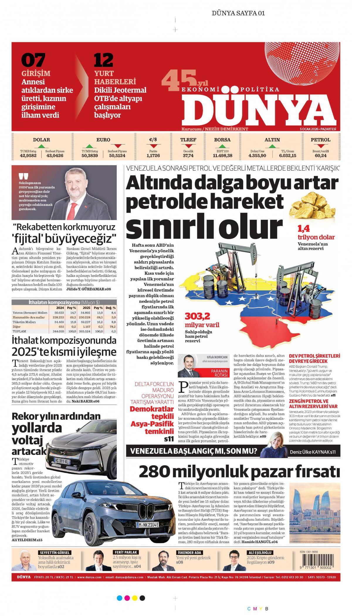 Dünya Gazetesi 5 January 2026, Monday Günü Manşeti