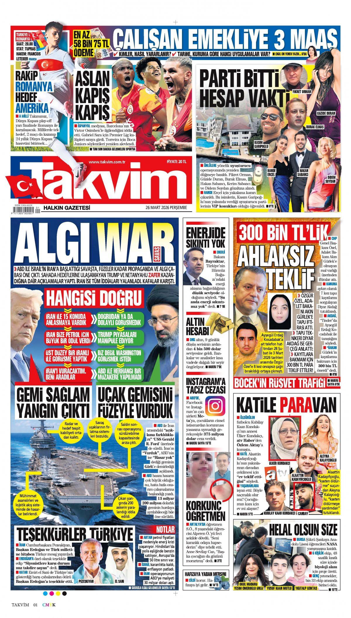 Takvim Gazetesi 26 March 2026, Thursday Günü Manşeti
