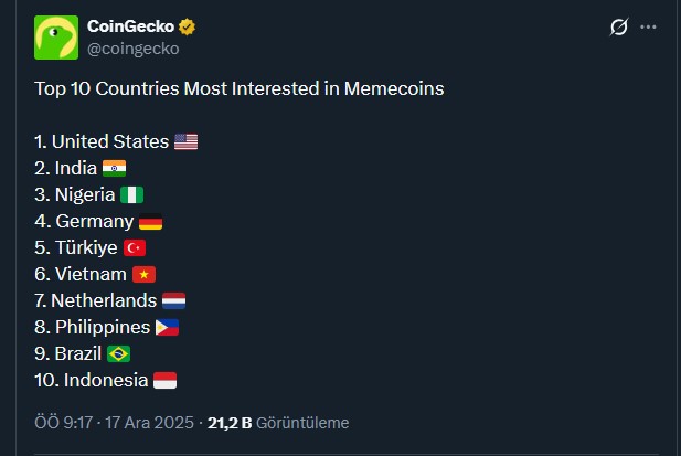 Ülkelere göre meme coin yatırımlarını ele alan Coingecko, son bir yılda meme tokenlara en fazla ABD ve Hindistan’dan yatırım geldiğini ortaya koydu. ABD’de kullanıcı sayısının %30’u yükseldiğini vurgularken daha dikkat çekici olan ise meme coinlere en yüksek ilgi gösteren ülkeler oldu. Rapora göre ilk 10 ülkeden 7’si ekonomisi gelişmekte olan ülke ve Türkiye bunlar arasında 5. sıraya sahip.