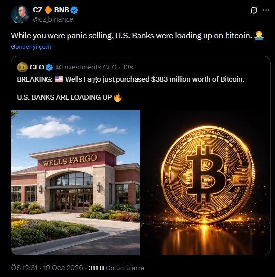 Bitcoin Haberleri: Kripto para piyasası yön arayışına devam ederken ABD bankaları Bitcoin alımını sürdürüyor. Binance eski CEO’su CZ, son paylaşımında Amerikan bankası Wells Fargo’nun alımları genişleterek 383 milyon dolarlık BTC alımını devam ettirdiğini alıntıladı. Amerikan bankalarının son birkaç ayda Bitcoin’e karşı ilgisinin artması kurumsal şirketlerin strateji değişimine geçmeye başladığını gösterir.