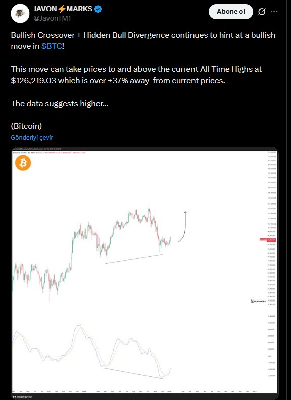 Bitcoin teknik grafiğine bakıldığında piyasa analistleri genellikle olumlu beklentilere sahip. Analist Javon Marks BTC grafiğinde boğa yönlü kesişim ve gizli boğa sapması olduğunu açıkladı. Trend dönüşünü gösteren gizli boğa sapması genellikle orta vadeli bir sinyaldir ve trend yapısının bozulmadan korunduğunu işaret eder. Marks’a göre bu hareket fiyatın mevcut aralıktan tüm zamanların en yüksek seviyesine kadar çıkmasını sağlayabilir.
