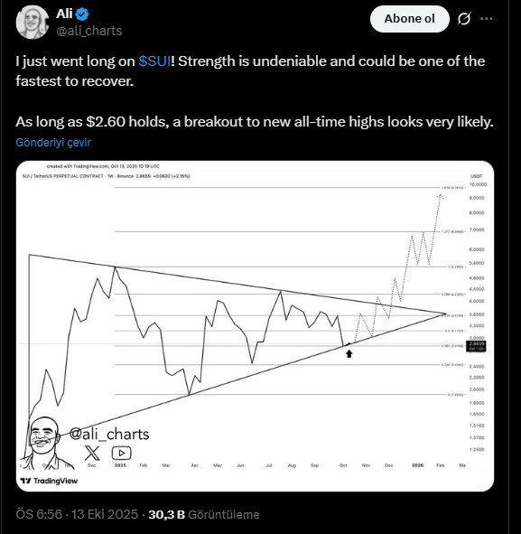 Satış baskısının artması ile gerileyen SUI, Analist Ali Martinez’e göre şu anda güçlü bir alım fırsatı olarak değerlendirilebilir. SUI coin için uzun pozisyon açtığını ve hızlı bir toparlanma beklediğini açıklayan Martinez, altcoin için 2,60 dolar seviyesini işaret etti. SUI bu seviyede tutunmayı başarırsa yeni rekor seviyelere doğru çıkış yakalayabilir.