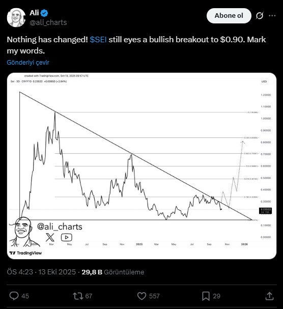 Güncel olarak piyasa zayıf seyretmesine rağmen büyük altcoinlerin genel piyasa toparlanması sonrasında güçlü bir çıkış göstermesi bekleniyor. Kripto para analisti Ali Martinez ise SUI, SEI, DOGE ve PENGU tokenın toparlanma ile bir rallinin eşiğinde olduğunu öngörüyor.