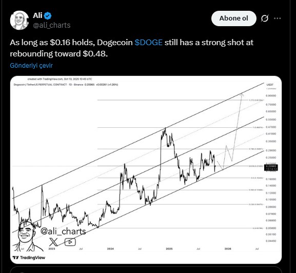 Teknik grafikte 0.19 dolar bölgesinin güçlü bir alım seviyesi olduğunu açıklayan Martinez, meme coin için 0.16 doların kritik bir direnç olduğunu açıkladı. Analist, DOGE 0.16 dolar bölgesinde tutunduğu sürece 0.48 dolara doğru toparlanma şansının yüksek olduğunu ifade etti. Bu tür bir yükseliş meme coin için %140’lik bir getiri anlamına geliyor.