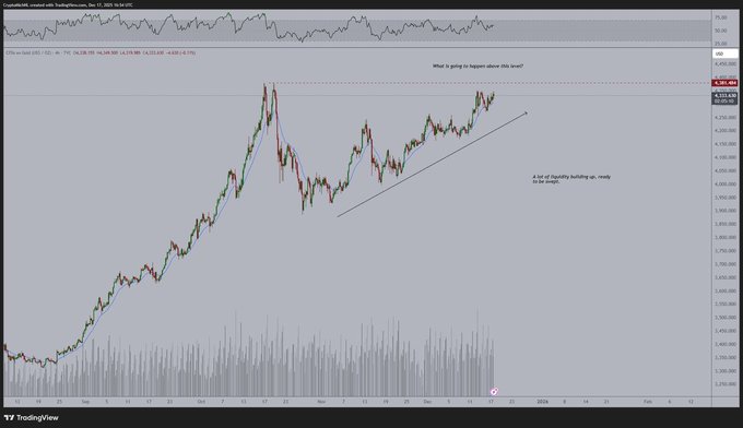 Önümüzdeki iki günü işaret eden Poppe, bunun sürpriz bir hamle olmayacağını ele alırken paylaştığı grafikte altın fiyatının kritik direnç seviyesine geldiğini gösterdi. Grafikte yükselen kanal içinde hareket eden altın 4.381 dolarlık ATH’nin altında kaldığını gösterdi. Analist 4.330 dolarda başlayan bu kanalın BoJ sonrası geniş piyasada riskten kaçınma davranışının etkisiyle kırılabileceğini tahmin ediyor.