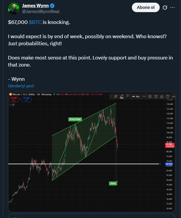 Hafta sonundan bu yana aralık Fed faiz indiriminin yeniden gündeme gelmesi ile BTC düşüşü durdu ve Bitcoin fiyatı 85 bin dolar üzerinde yatay bir seyre geçti. Buna karşın yeni bir analiz yayınlayan Analist James Wynn, hafta sonuna kadar ya da hafta sonunda BTC fiyatının 67.000 bin dolara düşeceğine dair bir olasılık yayınladı.