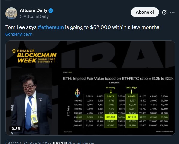 Binance Blockchain etkinliğinde öne çıkan diğer bir gelişme BitMine Başkanı Tom Lee’nin açıklaması oldu. Ethereum hazinesinin kurucusu olduğu için ETH hakkında güçlü tahminlere sahip olan Lee, Bitcoin için yeni tahminini açıkladı ve dört yıllık Bitcoin döngüsünün bittiğini buna karşın BTC’nin birkaç ay içinde 250.000 dolara ulaşacağını tahmin ediyor. Buna karşın ETH için tahminleri daha önce açıkladığı gibi 62.000 dolar.