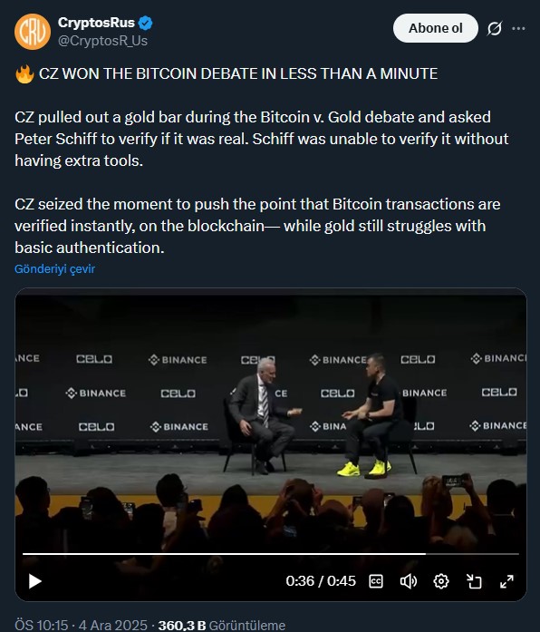 Tartışmada genel olarak CZ, BTC’nin uzun vadeli bir araç olduğunu ve zamanla altından daha iyi performans göstereceğini savundu. BTC’nin altına karşı daha kolay doğrulandığını, kolay kullanıldığını ve şeffaflığını vurguladı.