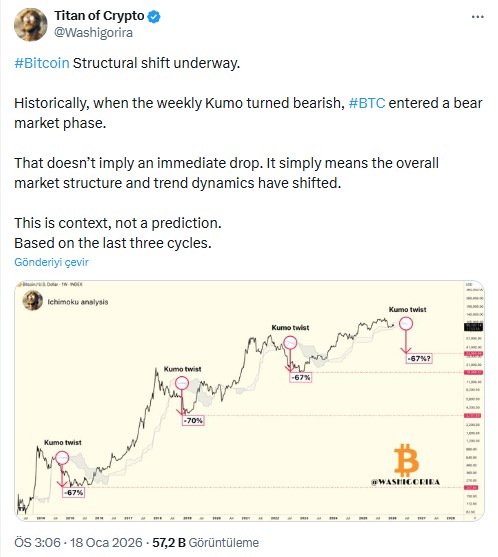Bununla birlikte Analist Titan of Crypto, Bitcoin Ichimoku grafiğinde ölüm kesişimi (death cross) oluştuğuna dikkat çekti. Ölüm kesişimi olarak bilinen sinyal, kısa vadeli ortalamanın uzun vadeli ortalama altına düşmesi ile ivmenin zayıfladığını gösterir.