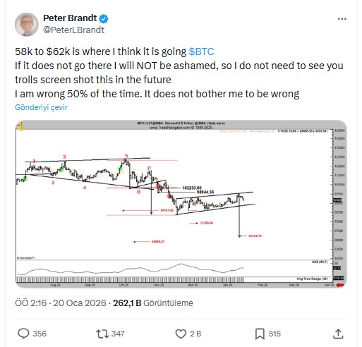 Son olarak olumsuz Bitcoin tahminleri ile tanınan deneyimli tüccar Peter Brandt, BTC’nin ayı döngüsüne gitmesi ile 58.000 – 62.000 dolar arasında gerileyeceğini tahmin ediyor. Yakın tarihli bir gönderisinde ayı piyasası için alt hedef bölgesini açıklayan Brandt, paylaştığı grafikte BTC fiyatının daraldığını ve sert bir kırılma görülebileceğini gösteriyor. Tüccar, ana düşüş trendi ile BTC’nin 58.8 dolara kadar gerilebileceğini öngörüyor.