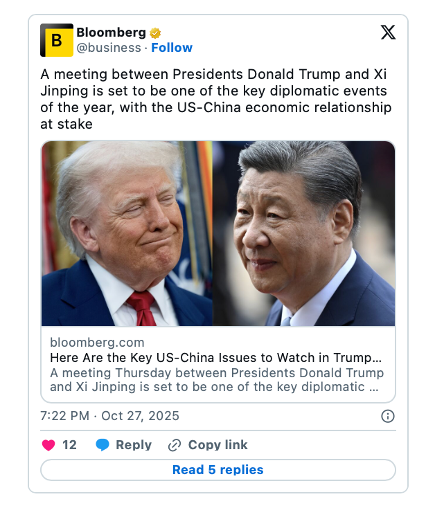Söz konusu önerinin, ABD Başkanı Donald Trump ve Çin Devlet Başkanı Xi Jinping tarafından bu hafta Güney Kore’de gözden geçirilmesi bekleniyor. Bu gelişme, son haftalarda riskli varlıklar üzerindeki baskıyı hafifletti. Yeniden gündeme gelen gümrük tarifesi tehditlerinin, Bitcoin’in önceki yükseliş trendini zirve noktasında sona erdiren etkenlerden biri olduğunu da belirtmek gerekir.