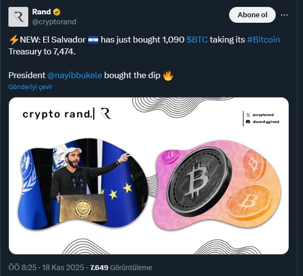 BTC fiyatının daha fazla ne kadar düşebileceği belirsizliğini korurken fiyat düşüşlerini değerlendiren El Salvador, 17-18 Kasım’da Bitcoin satın alımını devam ettirdi ve 1.090 BTC daha satın aldı. Toplam rezervini 7.474 BTC’ye çıkaran El Salvador’un bu alımı şimdiye kadarki tek günlük en büyük BTC alımı olarak kaydedildi. Toplam rezervin 740 milyon doları aştığı biliniyor.
