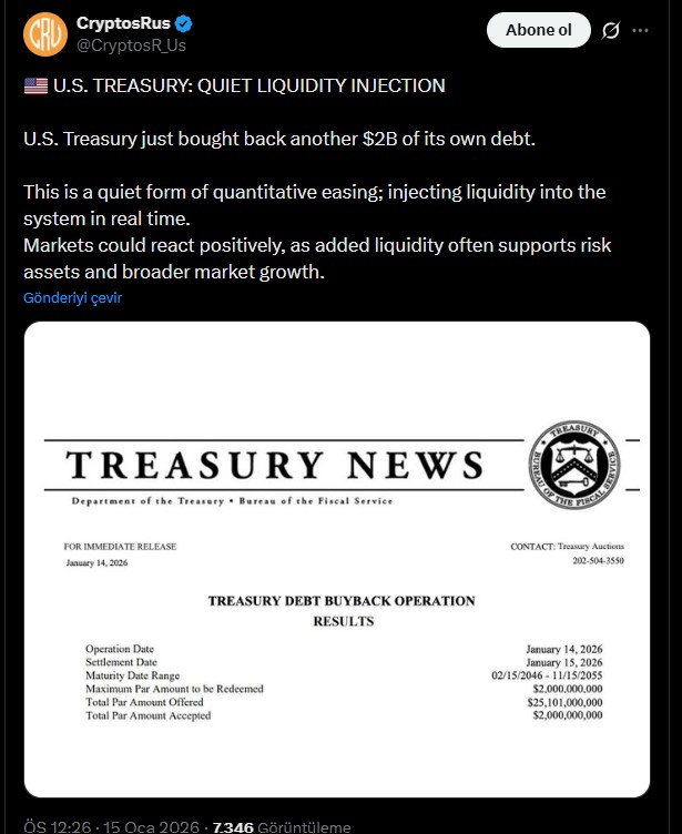 ABD Hazine Bakanlığı, 2025 son çeyreğinde 38 milyar dolarlık geri alım yapacağını duyurdu. Bununla birlikte geçtiğimiz aralık ayında 12,5 milyar dolarlık alım gerçekleştirdi. Güncel olarak ise 38 milyar dolarlık alım kapsamında 2 milyar dolarlık yeni bir tahvil geri alım yaptığını açıkladı.