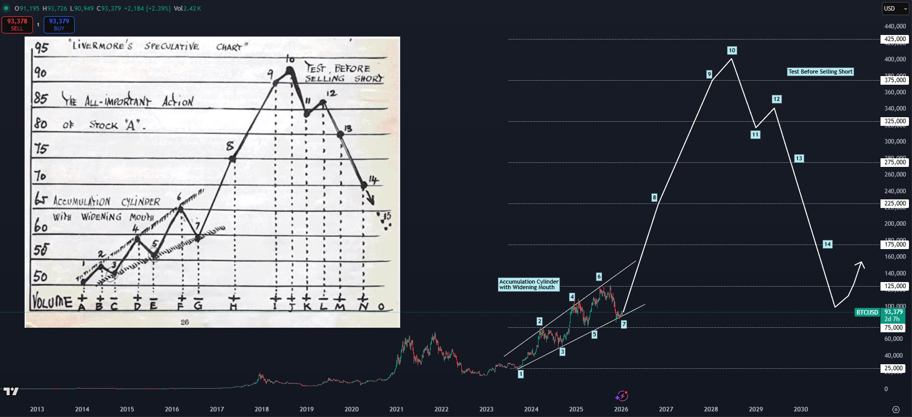Analist, Jasse Livermore piyasa döngüsü modelini kullanarak Bitcoin piyasa döngüsü arasındaki boğa ayı döngülerini karşılaştırdı. Livermore modeline göre piyasa beş aşamada hareket eder. Birikim dönemi sonrası trend yükselişine geçen piyasa ardından boğa evresine giriş yapar. Analist, modele göre Bitcoin için birikim evresinin yeni tamamlandığını öngörüyor.