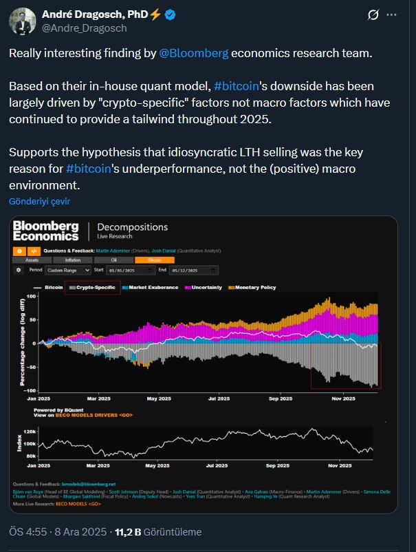 Bununla birlikte Bloomberg araştırma ekibinin ortaya koyduğu ve Andre Dragosch tarafından aktarılan ilginç bir veride Bitcoin düşüşünün makro faktörlerden değil “kriptoya özgü” nedenlerden kaynaklandığı görüldü. Bu araştırma, hisse piyasaları gibi riskli piyasalar yükselirken BTC fiyatının ekim ayından bu yana düşmesini de açıklıyor.
