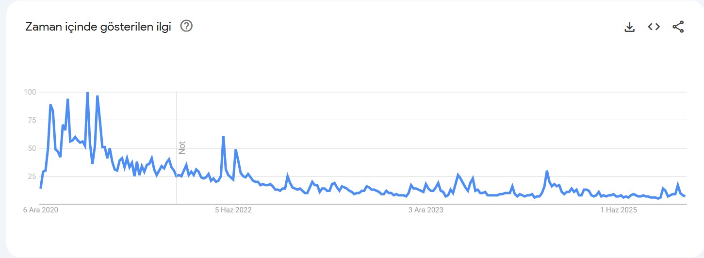 Santiment ve 10xResearch sosyal ölçümlerinde sosyal ilginin dip seviyelere gerilemesinin trendin değişebileceğine dair bir işaret olarak yorumlanıyor. Ancak daha uzun vadede bakıldığında 2021 rallisine göre Google’da kripto, meme coin, vb. aramalar 2025 döngüsünde önemli ölçüde düştü.