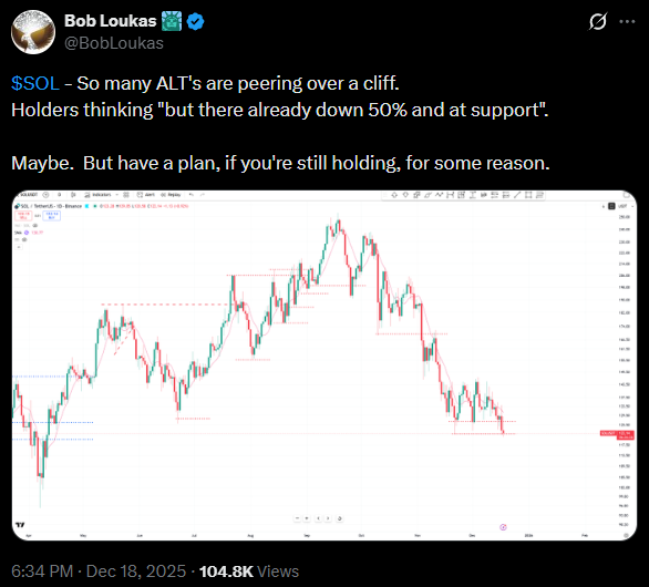 Analist Bob Loukas, X hesabında SOL grafiğini analiz ederek kısa vadeli hareketli ortalamanın aşağı eğilimde olduğuna vurgu yaptı. Mum grafiğinde uzun üst fittiler alım iştahından ziyade satış baskısının arttığını işaret ediyor. Bu aralığın korunamaması halinde SOL için 100 bin dolar seviyesi öne çıkabilir.
