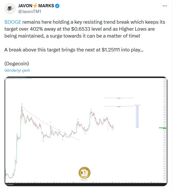 Orta ve uzun vadeli yükseliş modelinin devam ettiğini açıklayan Analist Javon Marks ise güncel olarak baskılanan DOGE coinin fiyatının yüksek dipler yapmaya devam ettiğini açıkladı. Alıcıların daha aktif olmaya başladığı bir trendin yaklaştığını işaret eden analist, ana modelin devam etmesi halinde yükseliş yönlü 0.65 dolarlık modelin teknik olarak geçerli olmaya devam ettiğini açıkladı.