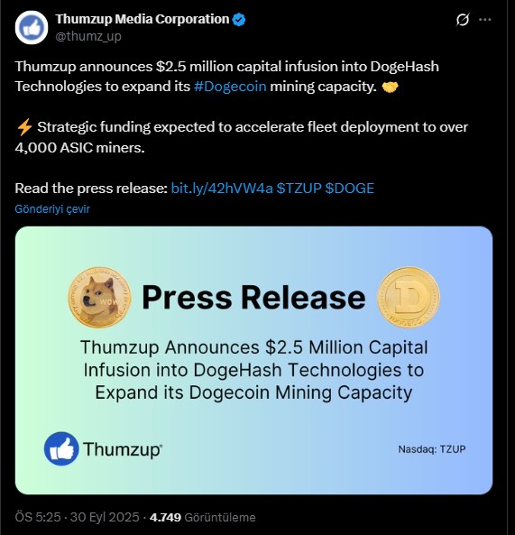 ABD Başkanı Donald Trump’a bağlı olan şirket olan Thumzup Media Corporation, Dogecoin ile birlikte Litecoin madenciliği yapan DogeHash Technologies şirketine 2,5 milyon dolar aktardı. Thumzup Media Corporation resmi sosyal medya hesabından duyurulan gelişmede yatırımın asıl aması Dogecoin madencilik kapasitesini arttırmak olduğu açıklandı. Meme coine olan kurumsal ilginin artması sağlayan bu gelişme, Dogecoin’in giderek meşrutiyet kazanmaya başladığını gösteriyor.