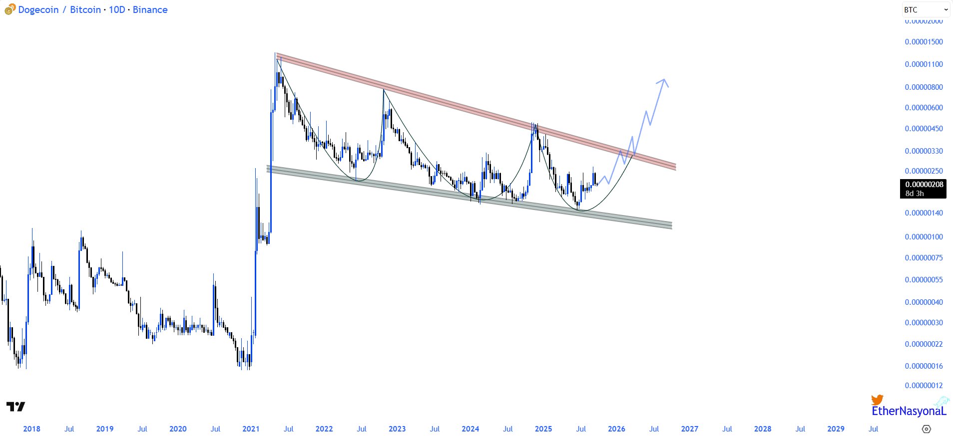 Öte yandan analistler de ekim ayı için güçlü bir yükseliş bekliyor. Analist EtherNasyonaL ise Dogecoin Bitcoin paritesini inceleyerek (grafik yukarıda) parabolik bir koşuyla meme coinin 1 dolara çıkmasını beklediğini açıkladı. Grafikte alçalan kama formasyonuna dikkat çekerek meme coinin momentum yakalamasının sadece zaman meselesi olduğunu açıkladı.