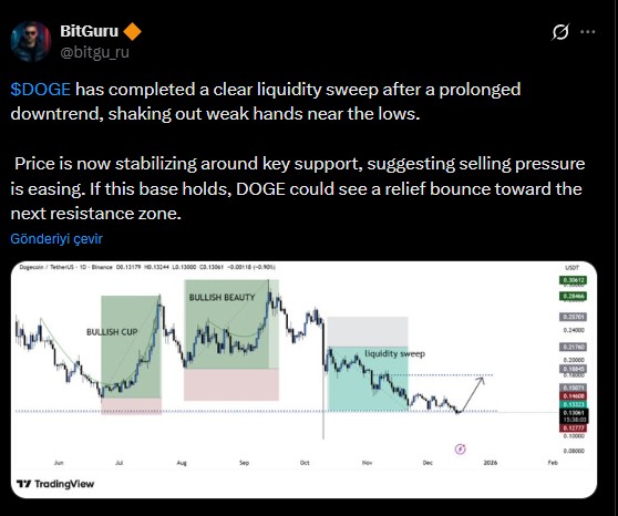 Analist BitGuru ise yakın tarihli bir gönderisinde Dogecoin’in uzun süreli düşüş trendinin ardından net bir likidite tasfiyesini tamamlayarak dip seviyelere ulaştığını açıkladı. Böylece zayıf ellerin piyasadan tasfiye edildiği düşünen analist, meme coinin artık kilit destek seviyelerinde istikrar kazandığını ifade etti. Ayrıca satış baskısının giderek azaldığının altını çizen BitGuru, Dogecoin’in taban fiyatta tutunmaya devam ederse bir sonraki direnç seviyesi olarak teyit ettiği 0.18 dolarda doğru toparlanmasını bekliyor.