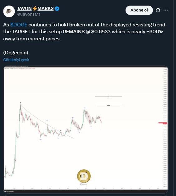 Meem coinin daha yüksek dipler oluşturmaya devam ettikçe yükseliş modelinin korunduğuna dikkat çeken analist, piyasa çöküşlerine rağmen 0.6533 dolarlık hedefin geçerliliğini koruduğunu açıkladı. Daha uzun vadede ise Dogecoin’in bu seviyeleri aşması ile bir sonraki rallisinde 1 doların üzerine çıkması bekleniyor.