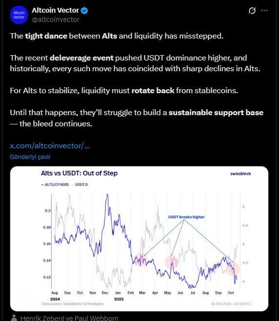 Buna karşın ayın sonunda Fed faiz indirimleri kripto paralar için güçlü bir katalizör olabilir. Swissblock’a bağlı Altcoin Vektör analizine göre son kaldıraç azaltması sonrasında yaşanan çöküş, USDT hakimiyetini yükseltti. Bu ise tarihsel olarak altcoinlerin çöküşü ile çakıştı.