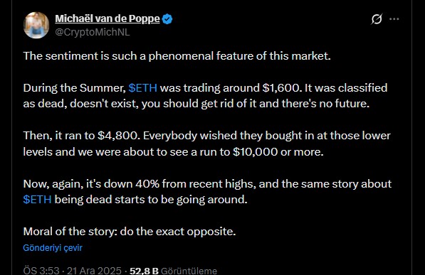 Ethereum fiyatı, Fusaka yükseltmesi gibi son gelişmelere rağmen güçlü bir çıkış yakalayamadı ve piyasa momentumu ile 3.000 doların altına kadar geriledi. Bu ise yatırımcının ETH piyasa duyarlılığının ciddi şekilde karamsarlığa kaydığını gösteriyor. Analist Micheal van de Poppe ise piyasa duygusunun dikkat çekici bir özellik olduğuna değinirken geçmişte benzer duygu durumlarının ortaya çıktığı dönemleri ele aldı.