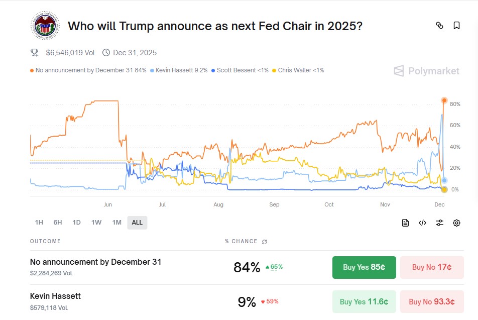 Resmi olarak kesinleşmemesine rağmen Trump’ın yaptığı açıklamalar bir sonraki Fed Başkanı’nın kripto yanlısı Kevin Hassett olma ihtimalini netleştirmeye başladı. Trump son toplantıda Hassett’i Fed Başkanı olarak çağırdı ve gelecek faiz indirimlerine dair güçlü bir sinyal verdi. Trump’ın açıklamalarından sonra Polymarket’te yeni Fed Başkanı’nın yüzde 86 Kevin Hassett olacağına tahmin ediyor. (Grafik altta)