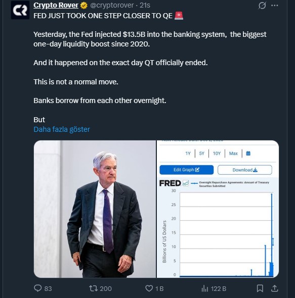 Bunun yanında Covid’den bu yana Fed’in ilk kez niceliksel sıkılaşmayı (QT) sonlandırarak bankalara 13,5 milyar dolarlık likidite akışı sağlaması güçlü bir boğa işareti olarak yorumlandı. Bunun yanında ilk kez ABD para piyasası fonu 8 trilyon doları aştı ve bunun ardından kripto paralarda güçlü bir akış bekleniyor. Öte yandan yeni Fed başkanına dair tartışmalar, Fed’in politika değişimi, faiz indirimi 2026’da kripto piyasası ve altın fiyatını bekleyen gelişmeler hakkında ipuçları veriyor.