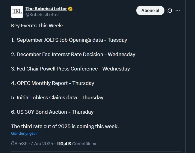 Bitcoin Haberleri: Kripto para piyasası, Fed’in 10 Aralık düzenleyeceği FOMC toplantısının odakta olduğu kritik bir haftaya giriyor. Faiz kararının 10 Aralık Çarşamba günü açıklanması bekleniyor ve piyasaların faiz indirim beklentisi %87 aralığında. Kripto para sektöründe ise Bitcoin fiyatının FOMC öncesinde yeniden istikrar kazanarak 90-91 bin dolar seviyesine yükselmesi olumlu karşılandı ve BTC güncel olarak bu aralıkta işlem görüyor. Bunun yanında FOMC faiz indiriminden olumlu etkilenen altın fiyatlarının da bu hafta yukarı yönlü hareket etmesi bekleniyor.