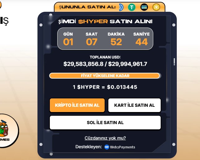 Erken alımsa HYPER token ön satışına katılmak isteyen yatırımcı için ise en güvenilir yöntem resmi web sitesi ve Best Wallet platformu. Best Wallet, erken aşamada güçlü potansiyele sahip coinleri satın alma fırsatı veriyor.