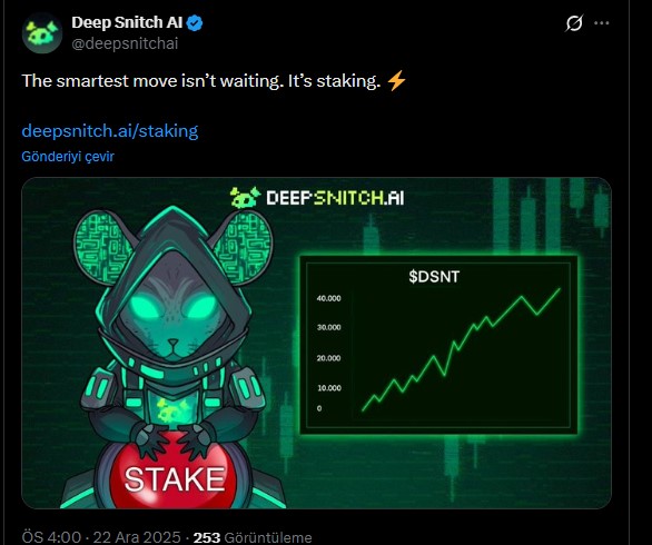 AI destekli yeni bir proje olan DeepSnitch (DSNT), yenilikçi bir AI ajanı gibi çalışır. Güncel piyasa verileri, sosyal medya trendlerine dayalı analizler, özel ön satışları incelemek gibi işlevleri bünyesinde toplayan proje, yatırımcıları için doğrudan raporlama yaparak kullanıcılara piyasada daha bilinçli kararlar vermesini sağlar. Zincir üstü verileri doğal bir şekilde analiz eden DeepSnitch AI, pazar fırsatlarını değerlendirme fırsatı sunar.