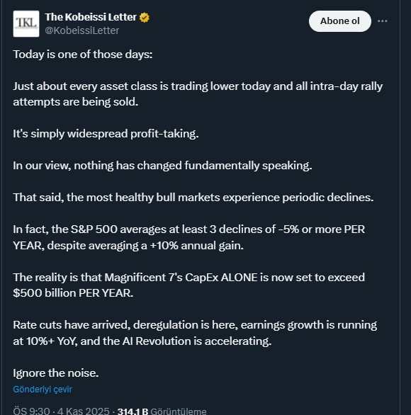 Faiz indirimleri, parasal genişleme ve yapay zeka devriminde hızlanma ile makro temellerde bir bozulma olmadığını açıkladı. Kobeissi Letter’a göre bu tür çöküşlerin, boğa piyasası evresinde görülebilecek normal bir durum olduğunu açıklarken gürültüyü duymazdan gelin mesajını veriyor.
