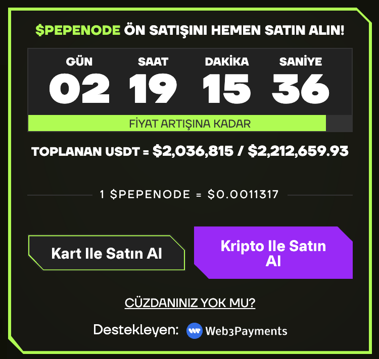 PEPENODE satın almak için ERC-20 uyumlu bir cüzdan (örneğin MetaMask veya Trust Wallet) oluşturmanız gerekir. Ardından resmi PEPENODE ön satış sitesine giderek cüzdanınızı bağlayabilirsiniz. Satın alma işlemleri ETH, BNB veya USDT ile yapılabiliyor. İşlem tamamlandığında, tokenlar cüzdanınıza aktarılıyor veya projenin belirlediği listelenme tarihine kadar bekleme sürecine giriyor. Ek olarak, bazı kullanıcılar tokenlarını doğrudan sanal nod satın almak veya staking için kullanabiliyor. Bu da erken dönemde aktif kazanç fırsatları sunuyor.