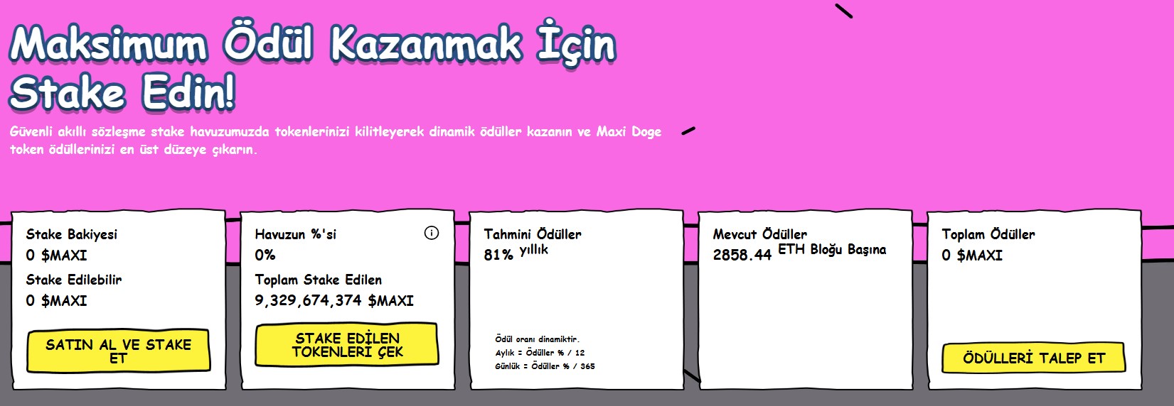 Topluluğu canlı tutmak için staking ödülleri sunan ve MAXI yarışmaları ile canlı bir ekosistem yaratmayı hedefler. Erken destekçiler için yıllık %81 staking getirisi sunar. MAXI ödülleri ve oyunlaştırılmış turnuvalar ile pump dinamiklerini destekler.