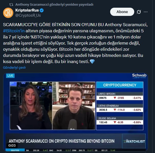 CNBC röportajında konuşan Scaramucci, mevcut piyasa çöküşünü “Bitcoin’in son oyunu” olarak adlandırdı ve önümüzdeki 5 ila 7 yıl içinde BTC’nin altının piyasa değerinin yarısına ulaşacağını söyledi. Güncel olarak 2025 sonunda altının piyasa değeri 29 trilyon doları geçti ve küresel çapta en yüksek değere sahip varlık olarak yerini koruyor. Bitcoin piyasa değeri ise güncel olarak 1,8 trilyon dolar.