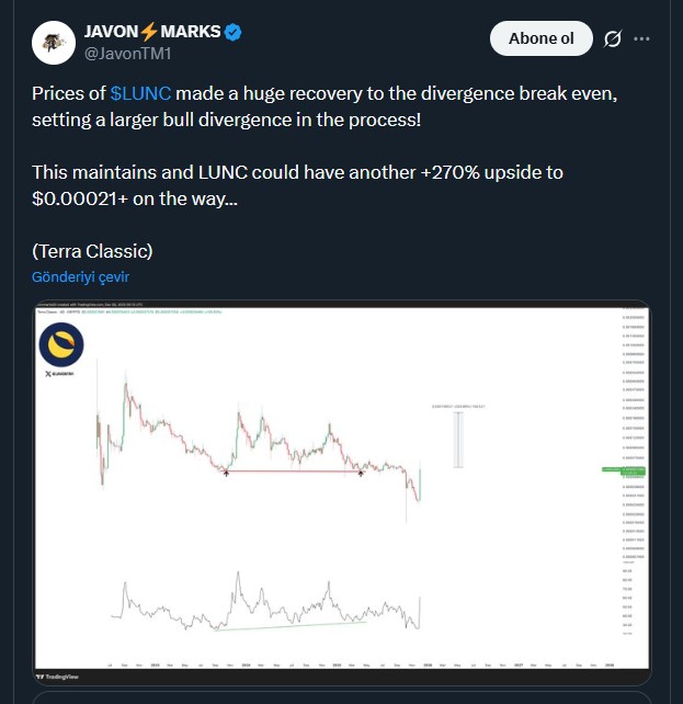 LUNC yükselişinin kısa süreli olduğunu düşünülmesine rağmen Analist Javon Marks, son analizinde altcoinin yüzde 270 daha yükselebileceğini öne sürdü. Önceki gönderilerinde LUNC grafiğinde boğa ayrışmasına dikkat çekti. Boğa ayrışması tipik olarak indikatörler ile fiyatın ters yönde hareket etmesine dayanır.