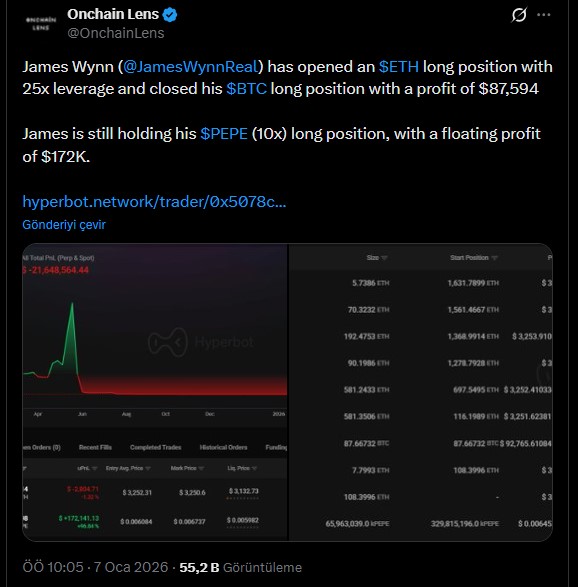 PEPE ve ETH fiyatını analiz eden ve erken PEPE yatırımcısı olarak 25 milyon dolardan fazla kazandığı bilinen yatırımcı James Waynn, kısa BTC pozisyonunu kapayarak uzun pozisyonlara geçti. OnChainLens verilerine göre balina 25x kaldıraçla ETH uzun pozisyonu açtı. Ayrıca yatırımcının mevcutta 172.000 dolarlık değişken kârla 10x kaldıraçla PEPE uzun pozisyonuna sahip olduğu biliniyor.