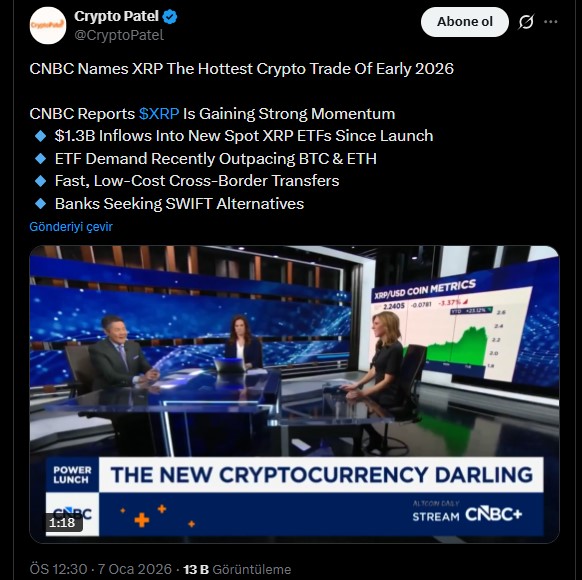 2026 başında piyasaya toparlanması ile en hızlı çıkışı gösteren altcoinlerden biri XRP coin oldu. Son bir haftada yüzde 20 yükselen altcoin, 2 dolar bandını aştıktan sonra 2.41 dolara kadar yükseldi. Altcoin fiyatındaki toparlanma piyasa iyimserliğini yükseltirken CNBC kanalından Brian Sullivan, analizci MacKenzie Sigalos verilerine göre 2026’nin en sıcak kripto trendinin XRP olacağını tahmin ediyor.