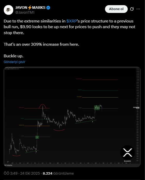 XRP fiyatının piyasa dalgalanması ve yeni gelişmeler dışında tarihsel modelleri takip ettiğini öne süren Analist Javon Marks, son gönderisinde XRP fiyatının bir sonraki hamlesinin 9 dolar olduğunu açıkladı. Tarihsel modeller göz önüne alındığında 2017-2021-2024 zirvelerini ele alan analist, mevcut fiyat döngüsünün önceki boğa koşusuna benzediğine dikkat çekti.