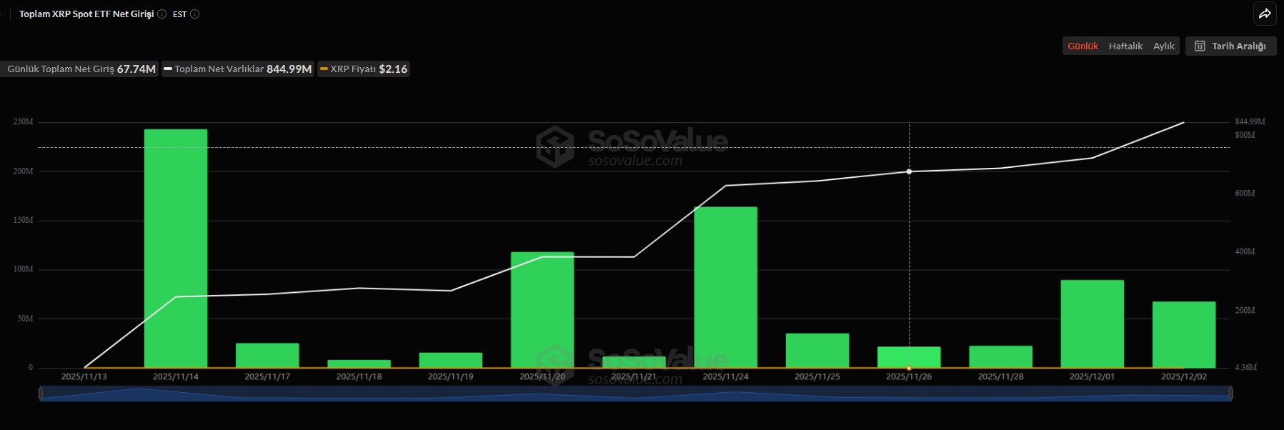 XRP ETF’leri lansman tarihinden bu yana pozitif bölgede kalmayı başardı ve aralık ayının başından bu yana daha güçlü net girişler görüyor. 1 Aralık Pazartesi 89.65 milyon dolarlık girişin ardından 2 Aralık Salı 67,74 milyon giriş daha gördü. Net girişlerin üst üste devam etmesi ile XRP toplam net girişi 844,99 milyon dolara ulaştı.