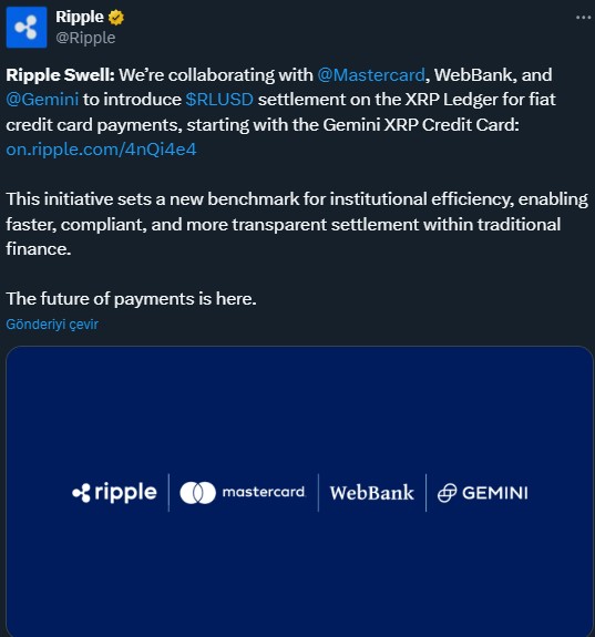 Ripple Swell etkinliğinde MasterCard, WebBank ve kripto para borsası Gemini ile iş birliği yaptığını duyurdu. Resmi sosyal medya hesabında Gemini aktif kullanılan kredi kartında arka planda Ripple’in stabilcoini RLUSD kullanılacağını açıkladı. MasterCard ile benzer bir ödeme sürecine dahil olan Ripple, geleneksel finansta RLUSD yerleşimini sağlamlaştırıyor.