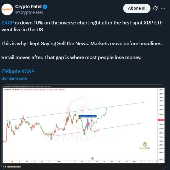 Altcoinin hızlı değer kaybının arkasında Bitcoin fiyatındaki teknik kırılma ile gelen panik var. Ancak Crypto Patel gibi bazı analistler, bunun diğer bir sebebinin ise “haberi sat” ile yatırımcının işlem yapmakta geç kalması olduğunu söylüyor. Buna göre RP ETF’leri dair ilk verilerin kesinleşmesi ile altcoin önceden fiyatlanmıştı ve ETF’ler beklenen etkiyi yaratmadı.