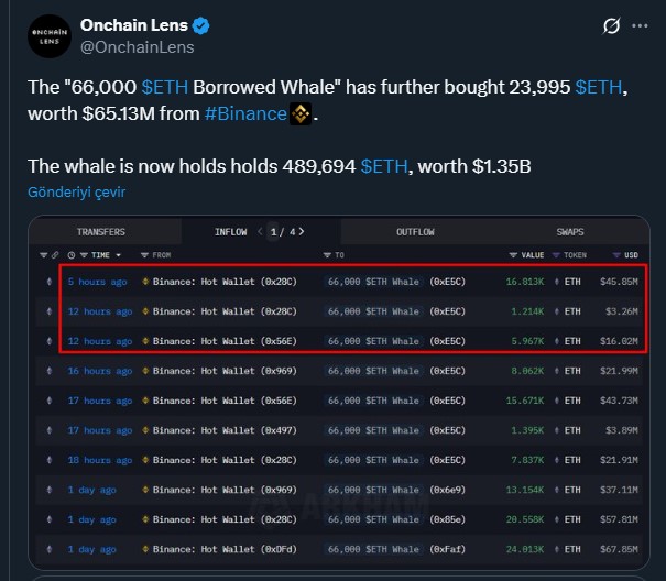 Bunun yanında aynı zaman zarfında daha önceki işlemlerinde 66.000 ETH ödünç alan bir balina Binance’dan 65.13 milyon dolarlık 23.995 ETH daha satın aldı. Arkham Intelligence verilerine göre güncel olarak 1.35 milyar dolar değerinde toplam 489.694 ETH tutuğu biliniyor.
