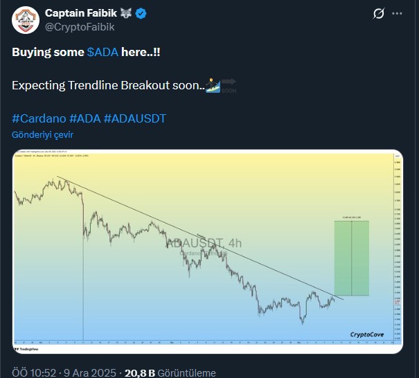 Son yükselişle düşüş trendinden çıkan altcoin, 0.50 dolar seviyesindeki direnci aşarak bu seviyenin üzerinde tutunabilirse yıl sonu rallisinde 0.70 doların üzerine çıkabilir. Analist Captain Faibik, ADA coinin alçalan trendle çıkması ile 0.80 doların üzerine kadar çıkacağını tahmin ediyor.
