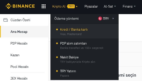 Binance borsası doğrudan Visa ve Mastercard kullanarak banka kartıyla kripto alım imkânı sağlar. Binance üzerinde kartla yapılan işlemler, genelde anlık olarak tamamlanır ve alınan kripto doğrudan spot cüzdana aktarılır. Buna ek olarak P2P ve banka transferi gibi alternatif yöntemler de borsa tarafından desteklenir.